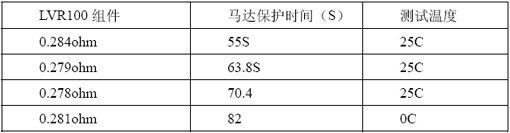 選取兩片Rmin電阻0.22ohm 的LVR100和功率電阻集成的組件,下面表1為馬達的保護時間。