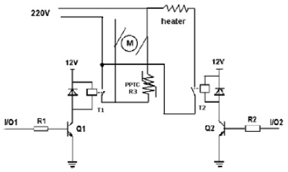 下圖3為多功能豆?jié){機馬達和加熱器的簡單電路示意圖。豆?jié){機所用馬達為220V直流馬達,繼電器的工作電壓為12V,豆?jié){機利用繼電器把MCU發(fā)出的低壓控制信號I/O來控制交流高壓信號的通斷,R3為PPTC可恢復(fù)電阻,T1和T2為繼電器。