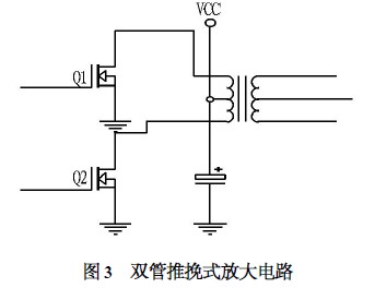 ( 3) 雙管推挽放大電路。圖3所示為雙管推挽放大電路。該方案采用了2 個MOS 管輪流導通,比采用4 個MOS管損耗低,而且輸出電壓比單端方式的要穩(wěn),為達到設(shè)計所需要的效率,本文選用了該方案。