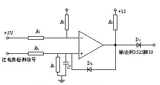 如圖1所示,過流保護(hù)信號取自CT2,經(jīng)分壓、濾波后加至電壓比較器的同相輸入端,如圖4所示。當(dāng)同相輸入端過電流檢測信號比反相輸入端參考電平高時(shí),比較器輸出高電平,使D2從原來的反向偏置狀態(tài)轉(zhuǎn)變?yōu)檎驅(qū)?并把同相端電位提升為高電平,使電壓比較器一直穩(wěn)定輸出高電平。同時(shí),該過電流信號還送到SG3525的腳10。當(dāng)SG3525的腳10為高電平時(shí),其腳11及腳14上輸出的脈寬調(diào)制脈沖就會立即消失而成為零。