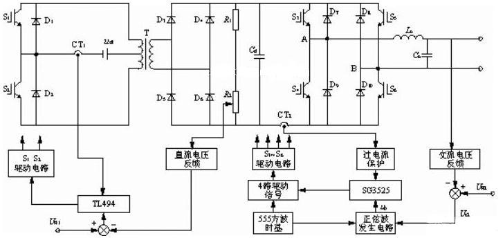 再經(jīng)過全橋DC/AC逆變電路,得到220V/50Hz交流電壓輸出。為保證系統(tǒng)可靠運(yùn)行,防止主電路對控制電路的干擾,采用主、控電路完全隔離的方法,即驅(qū)動信號用光耦隔離,反饋信號用變壓器隔離,輔助電源用變壓器隔離等。