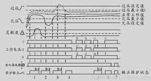 如工作電壓超出其欠壓設(shè)定值時(shí),吸合工作觸點(diǎn)進(jìn)入所設(shè)定的延時(shí)保護(hù)狀態(tài)(設(shè)定時(shí)間為0~30s)。待延時(shí)結(jié)束后,控制器工作觸點(diǎn)釋放,由接通狀態(tài)變至斷開(kāi)狀態(tài),直至電壓重新回至正常電壓工作帶。在工作時(shí)序圖中,保護(hù)觸點(diǎn)狀態(tài)2、3即為欠壓保護(hù)工作狀態(tài)。