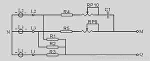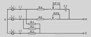 在保護(hù)器電源輸入端⑤、⑥、⑦串接相應(yīng)的RC移相電路(R4、RP9、C11、RP10、R5、R3)。調(diào)整相應(yīng)電位器RP9、RP10,使加至整流橋輸入端M、Q的電壓為確定值(在保護(hù)器工作電源處于額定電壓下進(jìn)行調(diào)整)。如工作電壓有波動(dòng),則由相應(yīng)RC移相電路使整流橋電壓輸入端電壓發(fā)生變化,從而使IC3A②端電壓Vcc也發(fā)生變化。在取樣電路中加入V1穩(wěn)壓管,則保證電壓檢測(cè)值不得超過(guò)V1穩(wěn)壓值。如超出,則IC3A中V③<V②,輸出①端為“0”,并使IC3B⑤端電平為“0”(C6經(jīng)R28放電,電平下降);同時(shí),IC3B輸入端V⑤<V⑥(V⑥電平由R24、R23分壓取得),輸出端⑦亦為“0”,使IC2⑥端電平為“0”,產(chǎn)品處于保護(hù)狀態(tài)。