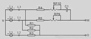 在保護(hù)器電壓處于正常工作帶時(shí),且工作電源端所加電壓相序(L1、L2、L3)為正相序,工作保護(hù)觸點(diǎn)吸合。如L1電壓呈斷相狀態(tài)時(shí),則其余兩相呈過(guò)壓狀態(tài),保護(hù)器也隨之進(jìn)入保護(hù)狀態(tài)。當(dāng)L1相又重新恢復(fù)供電,且加入電壓的L1、L2、L3都在其規(guī)定的正常工作帶范圍內(nèi)時(shí),保護(hù)觸點(diǎn)6又重新開(kāi)始吸合工作。當(dāng)加入工作電源輸入端由L1、L2、L3變?yōu)長(zhǎng)2、L1、L3或L3、L2、L1時(shí),因相序發(fā)生變化,保護(hù)器的保護(hù)觸點(diǎn)都呈釋放斷開(kāi)狀態(tài),無(wú)保護(hù)功能。