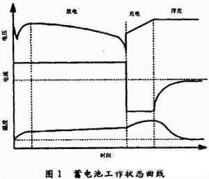 蓄電池在工作工程中主要具有3種工作狀態(tài):放電狀態(tài)、充電狀態(tài)和浮充狀態(tài)。處于放電狀態(tài)時,蓄電池將儲蓄的化學(xué)能轉(zhuǎn)化為電能供給負(fù)載;充電狀態(tài)是在蓄電池放電之后進(jìn)行能量儲蓄的狀態(tài),此種狀態(tài)下電能轉(zhuǎn)化為化學(xué)能存儲起來;浮充狀態(tài)則是蓄電池維持一定化學(xué)能存儲量所要保持的工作狀態(tài),浮充狀態(tài)下的蓄電池的儲能不會因為自放電而損失。放電、充電、浮充電3個狀態(tài)構(gòu)成蓄電池的一個完整的工作循環(huán)。傳統(tǒng)的充電器采用串聯(lián)充電方式,通過各個電池的電流都是一樣的。盡管采用了三段式的充電方法,但是充電時能控制的電壓只是電池組的串聯(lián)電壓,仍然伴有電池組充電不均衡并且擴(kuò)大的現(xiàn)象。蓄電池工作狀態(tài)曲線如圖1所示。因此在此基礎(chǔ)上采用一種新的解決方法。