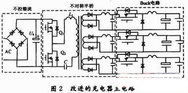 改進(jìn)的新型充電器主電路,如圖2所示。前級采用軟開關(guān)不對稱半橋?qū)崿F(xiàn)了多路的隔離輸出,并且利用自身產(chǎn)生的寄生參數(shù),實現(xiàn)諧振式零電壓軟開關(guān)以此減小開關(guān)的損耗,同時也避免了因變壓器漏感而帶來的電壓尖峰。后級采用成熟簡單的Buck電路拓?fù)洌瑢崿F(xiàn)降壓并用此來滿足三段式充電的要求。