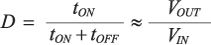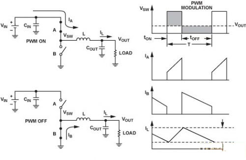 目前的低功耗同步降壓調節(jié)器以脈寬調制(PWM)為主要工作模式。PWM保持頻率不變,通過改變脈沖寬度(tON)來調整輸出電壓。輸送的平均功率與占空比D成正比,因此這是一種向負載提高功率的有效方式。
