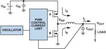 在圖 3 中,開關 A 和開關 B 分別利用 PFET 和 NFET 開關實現(xiàn),構成一個同步降壓調節(jié)器。“同步”一詞表示將一個 FET 用作低端開關。用肖特基二極管代替低端開關的降壓調節(jié)器稱為“異步”(或非同步)型。處理低功率時,同步降壓調節(jié)器更有效,因為 FET 的壓降低于肖特基二極管。然而,當電感電流達到 0 時,如果底部 FET 未釋放,同步轉換器的輕載效率會降低,而且額外的控制電路會提高 IC 的復雜性和成本。