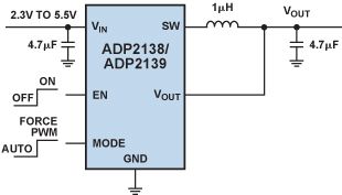 ADP2138 是一款緊湊型 800 mA、3 MHz、降壓 DC-DC 轉換器。圖 4所示為典型應用電路。圖 5顯示了強制 PWM工作模式下和自動 PWM/PSM 工作模式下的效率改善情況。由于頻率存在變化,PSM 干擾可能難以濾除,因此許多降壓調節(jié)器提供一個 MODE 引腳(如圖 4 所示),用戶可以通過該引腳強制器件以連續(xù) PWM 模式工作,或者允許器件以自動 PWM/PSM 模式工作。MODE 引腳既可以通過硬連線來設置任一工作模式,也可以根據(jù)需要而動態(tài)切換,以達到省電目的。