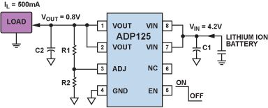 電池的續(xù)航時間是新型便攜式設備設計高度關注的一個特性。提高系統(tǒng)效率可以延長電池工作時間,降低更換或充電的頻度。例如,一個鋰離子充電電池可以使用ADP125 LDO以 0.8 V電壓驅動一個 500 mA負載,如圖 6 所示。該LDO的效率只有 19% (VOUT/VIN × 100% = 0.8/4.2 × 100%)。LDO無法存儲未使用的能量,因此剩余的 81%的功率(1.7 W)只能以熱量形式在LDO內部耗散掉,這可能會導致手持式設備的溫度迅速上升。如果使用ADP2138 開關調節(jié)器,在 4.2 V輸入和 0.8 V輸出下,工作效率將是 82%,比前一方案的效率高出 4 倍多,便攜式設備的溫度升幅將大大減小。這些系統(tǒng)效率的大幅改善使得開關調節(jié)器大量運用于便攜式設備。