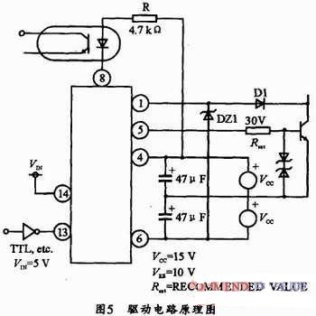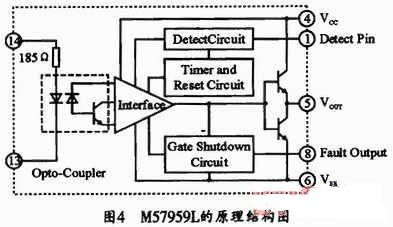 M57959L是日本三菱公司生產(chǎn)的混合集成IGBT驅(qū)動器,其內(nèi)部原理結(jié)構(gòu)如圖4所示。它由高速光電隔離輸入,絕緣強(qiáng)度高,可與TTL電平兼容。內(nèi)藏定時邏輯短路保護(hù)電路,并具有保護(hù)延時特性。芯片由正負(fù)電源供電,克服了單電源供電時負(fù)電壓不穩(wěn)的缺點(diǎn),驅(qū)動功率大,可驅(qū)動200A/600V或100A/1200V的IGBT模塊。由M57959L構(gòu)成的驅(qū)動電路如圖5所示。