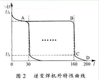 圖2所示即為高頻逆變焊機(jī)所普遍采用的一種行之有效的恒流帶外拖的外特性曲線。其中Uk為空載電壓,即焊機(jī)不工作時(shí)的輸出電壓。一個(gè)較高的空載電壓有助于起弧階段快速建立起穩(wěn)定的工作狀態(tài)。一般空載電壓為90V左右;AB段為起弧階段,即焊機(jī)建立工作狀態(tài)的過渡過程,近似于恒壓輸出。這個(gè)過程中變換器以最大脈寬輸出,以最快速度達(dá)到設(shè)定工作電流時(shí)該階段結(jié)束;BC段為穩(wěn)定工作階段,近似為恒流過程,使焊機(jī)具有一個(gè)平穩(wěn)、恒定的工作電流;CD段為外拖階段,由于焊機(jī)在頻繁的起弧和工作過程中焊槍很容易和工件短路粘連,造成焊接過程不順暢,如果此時(shí)系統(tǒng)檢測到一個(gè)較低的短路電壓后能夠相應(yīng)地增大輸出電流值,就可以將粘連部分熔斷,從而獲得一個(gè)連續(xù)、平穩(wěn)的焊接過程。