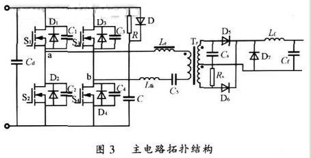 本系統(tǒng)所采用的全橋變換器拓?fù)浣Y(jié)構(gòu)如圖3所示。主電路中選用了MOSFET作為主功率開關(guān)器件,這是因?yàn)楸鞠到y(tǒng)的設(shè)計(jì)頻率為100 kHz,而與IGBT一般最高工作在幾十kHz相比,MOSFET的工作頻率則要高的多。另外由于MOSFET自身帶有反并聯(lián)二級(jí)管和較大的輸出電容,如圖3中D1~D4、C1~C4所示,為軟開關(guān)的實(shí)現(xiàn)提供了便利條件。變壓器副邊輸出整流結(jié)構(gòu)有全波整流(變壓器副邊三抽頭+兩只二級(jí)管)和全橋整流(變壓器副邊兩抽頭+四只二級(jí)管)兩種結(jié)構(gòu)可供選擇,前者適合于輸出低壓大電流的場合,后者適合于輸出高壓小電流場合。由于逆變焊機(jī)可看作是一個(gè)低壓大電流源.因此選用全波整流。