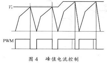 在本方案所采用的峰值電流控制模式下,腳19(RAMP)端的鋸齒波信號(hào)是從變壓器原邊的電流信號(hào)經(jīng)采樣整流得到的。但由于實(shí)際上原邊電流信號(hào)波形上升斜率較緩,與給定比較時(shí),容易因?yàn)楦蓴_或毛刺抖動(dòng)產(chǎn)生誤動(dòng)作。因此實(shí)際應(yīng)用時(shí),先將原邊電流的采樣整流值與芯片定時(shí)電容CT上的鋸齒波相疊加,經(jīng)過斜坡補(bǔ)償后,再送入腳19(RAMP)端進(jìn)行比較控制。峰值電流控制過程如圖4所示。