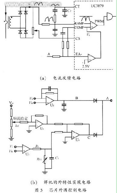 (2)外拖特性實(shí)現(xiàn) 正常工作時(shí),輸出電壓反饋值Vfb大于外拖給定值Vz,比較器U3的輸出為零,對加法器U4沒有影響,焊接電流由恒流給定值Iref決定;當(dāng)焊槍與工件粘連短路時(shí),Vfb小于VZ,比較器U3的輸出為高,相當(dāng)于給增大了Iref,UC3879內(nèi)部誤差放大器的輸出Ve也增大,焊接電流則隨之增大,從而實(shí)現(xiàn)外拖。
