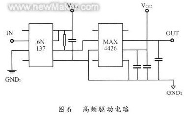 其中IN接自來于UC3879的輸出脈沖信號(hào),CND1接控制電路地信號(hào),GND2接被驅(qū)動(dòng)MOS-FET的源極。6N137是一個(gè)高速光耦,傳輸延遲時(shí)間僅有40 ns。從控制電路來的信號(hào)經(jīng)過光耦隔離后送至驅(qū)動(dòng)電路,使得控制電路和驅(qū)動(dòng)電路有較好的電氣隔離,消除對控制電路的十?dāng)_。MAX4426是一個(gè)專門用于M0SFET的高頻驅(qū)動(dòng)芯片,其內(nèi)部有兩個(gè)驅(qū)動(dòng)電路,可以很容易地并聯(lián)以提供較大的輸出功率。典型上升、下降時(shí)間僅為20ns,延遲時(shí)間小大于40ns,可工作于1MHz,提供1.5A的峰值輸出電流。