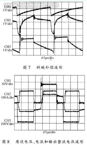 圖7為電流斜坡補(bǔ)償波形。通道3為原始電流采樣波形;通道1為用于補(bǔ)償?shù)匿忼X波;通道2為補(bǔ)償后波形。補(bǔ)償后斜率明硅增加。 圖8所不為原邊電壓(通道3)、原邊電流(通道2)和輸出整流電壓(通道1)波形。從圖8中可清楚地看出占空比損失。