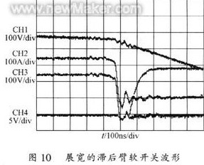 其中通道l和通道2分別為原邊電流、電壓波形;通道3為滯后臂管壓降,通道4為其驅(qū)動(dòng)波形。圖10是圖9的局部展寬波形。從中可以明顯地看到當(dāng)滯后臂管壓降已經(jīng)諧振到零后,驅(qū)動(dòng)脈沖才由低變到高,使其在零電壓下導(dǎo)通,實(shí)現(xiàn)軟開關(guān)。