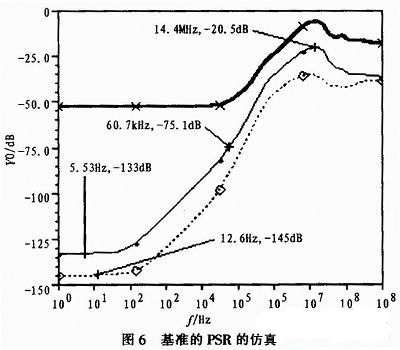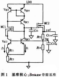 電子鎮(zhèn)流器的供電方式為半橋輸出接穩(wěn)壓管給芯片供電,其輸出電壓為高壓正弦波(50~100 kHz),加之芯片內(nèi)數(shù)字部分的干擾,這就給芯片的電源帶來較大的干擾。因此對芯片內(nèi)基準的中頻PSR(Power Supply Rejection,電源抑制)有較大要求。本文從此角度在Brokaw帶隙基準的基礎(chǔ)上進行改進,采用LDO與基準的級聯(lián)設(shè)計來增加其PSR。