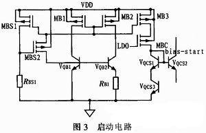 這樣雖然能啟動,但是,正常工作時,此大啟動電流bias-start將通過VQCS1和VQCS3流向地,增加了系統(tǒng)的負擔。因此,在電流輸出管MB3下加入控制管MBC,并使得在正常工作時,LDO的高電壓足以使MBC關(guān)斷,從而降低啟動電路的損耗。