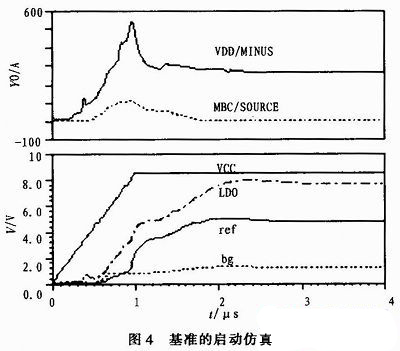 MBC控制作用的簡述:在1μs時流過100μA的啟動電流,當LDO、ref、bg建立最低工作電壓后,啟動電路開始關(guān)斷過程,電流急劇減小,并最終在2μs時接近0A。整個電路正常運行時消耗的電流是266μA。