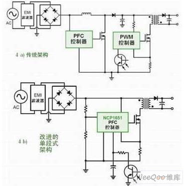 在這類可能需要采用PFC控制器的應(yīng)用中,傳統(tǒng)的解決方案是PFC控制器+PWM控制器的兩段式方案。這種方案支持模塊化,且認(rèn)證簡單,但在總體能效方面會有折衷,如假設(shè)交流-直流(AC-DC)段的能效為87%至90%,直流-直流(DC-DC)段能效為85%至90%,則總能效僅為74%至81%。隨著LED技術(shù)的持續(xù)改進(jìn),這種架構(gòu)預(yù)計將轉(zhuǎn)化為更加優(yōu)化、更高能效的方案。根據(jù)要求的不同,有多種可供選擇的方案,如:PFC+非隔離降壓、PFC+非隔離反激或半橋LLC、NCP1651/NCP1652單段式PFC方案。