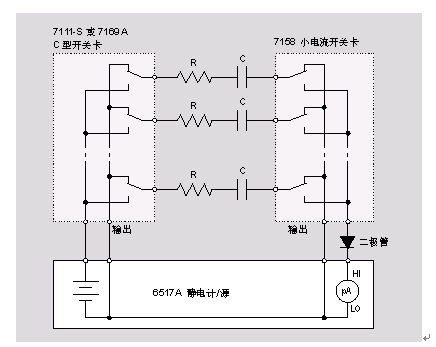 一個(gè)“同軸三柱-BNC”轉(zhuǎn)換器(7078-TRX-BNC型)被用于將6517A連接到7158型開(kāi)關(guān)卡。電容器通過(guò)低噪聲同軸電纜連接到7158型開(kāi)關(guān)卡??墒褂媒^緣線將7111-S開(kāi)關(guān)卡連接到電容器。7169A型是通過(guò)接線頭連接器進(jìn)行連接。