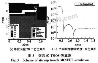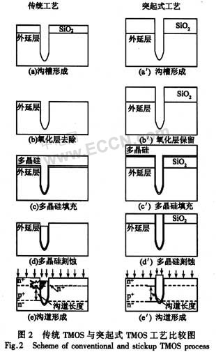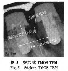 當(dāng)相鄰單位元胞尺寸不斷縮小后,尤其在設(shè)計(jì)柵極氧化膜較薄的器件時(shí),在傳統(tǒng)的TMOS工藝中,源區(qū)注入會(huì)穿透柵極側(cè)壁影響器件性能。采用突起式結(jié)構(gòu)可以有效地避免刻蝕工藝及源區(qū)注入對(duì)較短溝道器件的間接影響,消除了器件穿通的風(fēng)險(xiǎn),保證了器件的穩(wěn)定性能和可重復(fù)性。
