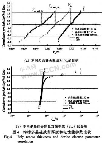 當(dāng)單位元胞相鄰間距為1.4 μm工藝時(shí),由于設(shè)計(jì)的溝道長度大約為0.5μm,源區(qū)結(jié)深大致為0.3μm,不得不考慮到傳統(tǒng)工藝下源區(qū)注入時(shí),多晶硅刻蝕工藝波動(dòng)所帶來的器件性能下降的風(fēng)險(xiǎn)。在傳統(tǒng)工藝中,當(dāng)多晶硅淀積完成后,須通過刻蝕來形成柵極區(qū)域,但是多晶硅去除量難以精準(zhǔn)控制,同時(shí)考慮到刻蝕工藝面內(nèi)均勻性的特點(diǎn),Si片內(nèi)中心與邊緣的去除量無法保證相同,從而為隨后的源區(qū)注人工藝留下了潛在的風(fēng)險(xiǎn)。如圖2傳統(tǒng)TMOS與突起式TMOS工藝比較圖2(e)所示,當(dāng)源區(qū)注入時(shí),如果柵極多晶硅刻蝕量過多,會(huì)導(dǎo)致源區(qū)高濃度的As+離子從柵極邊緣注入到溝道中,間接地減少了溝道長度,從而降低了閾值開啟電壓(Vth),尤其當(dāng)溝道長度較短時(shí),甚至?xí)?dǎo)致器件在正常工作狀態(tài)時(shí)發(fā)生漏源間穿通效應(yīng),最終導(dǎo)致器件失效。本文采用K·Shenai的突起式結(jié)構(gòu),在形成溝槽之后,先保留之前所生長的氧化層,然后直接生長柵極氧化膜和多晶硅,在柵極多晶硅形成后,才將先前生長的氧化層去掉,由此便形成了突起式多晶硅結(jié)構(gòu),從而可以保證在隨后的源區(qū)As+離子注入時(shí),As+離子無法從溝槽側(cè)壁注入到溝道中,從根本上避免了發(fā)生源漏極之間穿通的可能性,降低了器件對(duì)刻蝕工藝的依賴程度。這點(diǎn)在器件柵極氧化膜厚度較薄的情況下尤其明顯,此時(shí)如果采用傳統(tǒng)工藝,源區(qū)離子注入時(shí),As+離子更容易從側(cè)壁注入到溝道中,從而影響溝道長度。
