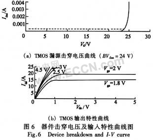 為了驗(yàn)證這一理論,特別設(shè)計(jì)了在傳統(tǒng)工藝下,柵極頂部到外延層表面的多晶硅去除量(130 nm/230 nm/310 nm)的試驗(yàn)。通過器件的電性能參數(shù)比較,如圖4(a)所示,可以看到,隨著多晶硅去除量的增加,閾值開啟電壓隨之降低,說明了器件溝道有效長度變短,源區(qū)離子通過側(cè)壁注入到溝道中,源區(qū)結(jié)深在溝道表面變深。同時(shí)由圖4(b)可知,漏源間漏電流也有明顯的區(qū)別,當(dāng)多晶硅去除量在310 nm時(shí),從累積概率圖中可以看到有部分區(qū)域漏電流增大,這一現(xiàn)象隨著多晶硅去除量的減少而逐步消失,從而驗(yàn)證了溝道有效長度與多晶硅去除量有很強(qiáng)的相關(guān)性。由此可見,為了減少器件性能與刻蝕工藝的相關(guān)性,采用突起式多晶硅技術(shù)是非常必要的。圖5是采用透射電子顯微鏡所得到的突起式TMOS實(shí)際截面圖??梢钥吹皆谠搱D中的突起式多晶硅結(jié)構(gòu)以及溝槽式接觸,單位元胞相鄰間距為1.4μm的n型TMOS,單個(gè)芯片有源區(qū)面積為0.4 nm2,并采用TSOP6封裝。圖6(a)、(b)分別是器件擊穿電壓曲線以及輸出特性曲線。由圖6(a)可以看到,當(dāng)漏端漏電流為250μA時(shí),擊穿電壓為24 V,滿足大于20 V的設(shè)計(jì)需要,由圖6(b)可以看到,當(dāng)柵極開啟電壓為4.5 v、工作電流為5 A時(shí),對(duì)應(yīng)的導(dǎo)通電阻大致為23.75 mΩ。由于芯片有源區(qū)設(shè)計(jì)尺寸為0.4 mm2,最終Rdson·A為9.5 mΩ·mm2