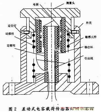 差動式電容載荷傳感器結(jié)構(gòu)示意圖如圖2所示。它主要由測量頭、外殼、敏感元件(彈性體)、定極柱、動極柱、電極、等位環(huán)、引出線等構(gòu)成。其特點為:測量范圍寬;靈敏度高,便于拾取信號;極板間不接觸、不變形、不磨損,機械損失小、壽命長;電容傳感器受溫度影響??;動態(tài)性能好;結(jié)構(gòu)簡單、適應(yīng)各種惡劣環(huán)境和場合。
