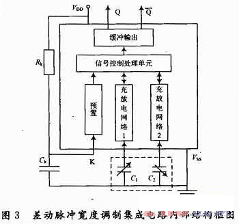 差動式電容載荷傳感器是將被測載荷的變化轉(zhuǎn)換為電容量的變化輸出,而電容傳感器所產(chǎn)生的電容量很微小,電容極板引線與地之間產(chǎn)生的雜散電容往往大于被測電容。因此小電容轉(zhuǎn)換測量技術(shù)一直被人們所重視。然而,一般的檢測電路結(jié)構(gòu)比較復(fù)雜,精確度較低,不能滿足測量要求。為了提高測量的靈敏度,針對差動式電容載荷傳感器,在基于四相檢測技術(shù)的電荷轉(zhuǎn)移式電容檢測電路的基礎(chǔ)上,設(shè)計采用了差動脈沖寬度調(diào)制集成測量電路,該電路具有集成度高、實現(xiàn)了電容傳感器頭有源化、輸出脈沖方波、省去高頻激勵信號源、功耗低、抗干擾能力強、分辨率高等特點,尤其適合差動式電容傳感器的測量。其內(nèi)部結(jié)構(gòu)框圖如圖3所示,圖中的虛線框內(nèi)為差動式電容傳感器的兩個可變電容C1和C2。