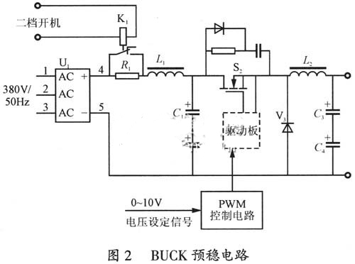 三相交流配電經(jīng)整流濾波電路之后,形成500V左右的直流電壓加在。BUCK預(yù)穩(wěn)電路的輸入端。其中K1為抑制合閘浪涌電壓而設(shè)置的,其二檔吸合信號由電源控顯電路給出。S2為BUCK功率開關(guān)管,其工作脈沖由PWM控制電路給出,為了保證電源具有足夠的動態(tài)特性,該功率開關(guān)管工作頻率為100kHz左右。PWM控制器輸出脈沖寬度,由電壓設(shè)定信號給出。當(dāng)電壓設(shè)定信號由0~10V變換時,PWM控制器輸出的脈沖占空比在0~0.85的范圍內(nèi)變化。L2為儲能電感,由于BUCK電路的占空比在0~0.85大范圍變化,為了保證電路起到預(yù)穩(wěn)作用,需要避免輸出電流斷續(xù),同時不至于設(shè)計(jì)余量過大,采用了額定負(fù)載條件下的計(jì)算值,實(shí)際工作情況良好。