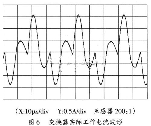 整個變換器電路依然采用PFM的工作模式,當(dāng)前級預(yù)穩(wěn)電源輸出0~500V直流電壓時,變換器以固定的脈沖寬度驅(qū)動橋臂的功率開關(guān)管。為了保證電源在電子槍束流產(chǎn)生時能穩(wěn)定工作,設(shè)計(jì)了取樣閉環(huán)控制功能,當(dāng)輸出偏離電壓設(shè)定值時,變換器通過脈沖頻率調(diào)節(jié)得到穩(wěn)定的輸出,電子槍高壓電源實(shí)際工作頻率為3~25kHz。改進(jìn)后的串聯(lián)諧振變換器如圖5所示,變換器的實(shí)際工作電流波形如圖6所示。