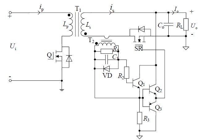 該驅(qū)動(dòng)電路的基本工作原理:電流互感器T2 與次級同步整流管SR 串聯(lián)在同一支路,用來檢測SR 的電流。當(dāng)有電流流過SR 的體二極管,則在電流互感器的二次側(cè)感應(yīng)出電流,該電流通過R1 轉(zhuǎn)變成電壓,當(dāng)電壓值達(dá)到并超過晶體管Q1 的發(fā)射結(jié)正向電壓時(shí),Q1 導(dǎo)通,達(dá)到二極管VD 導(dǎo)通電壓時(shí),VD 導(dǎo)通對其箝位。晶體管Q1 導(dǎo)通后,輸出電壓通過圖騰柱輸出電路驅(qū)動(dòng)SR 開通。當(dāng)SR 中的電流在電流互感器二次側(cè)電阻R1 上的采樣電壓降低到Q1 的導(dǎo)通閾值以下時(shí),Q1 關(guān)斷,SR 關(guān)斷。