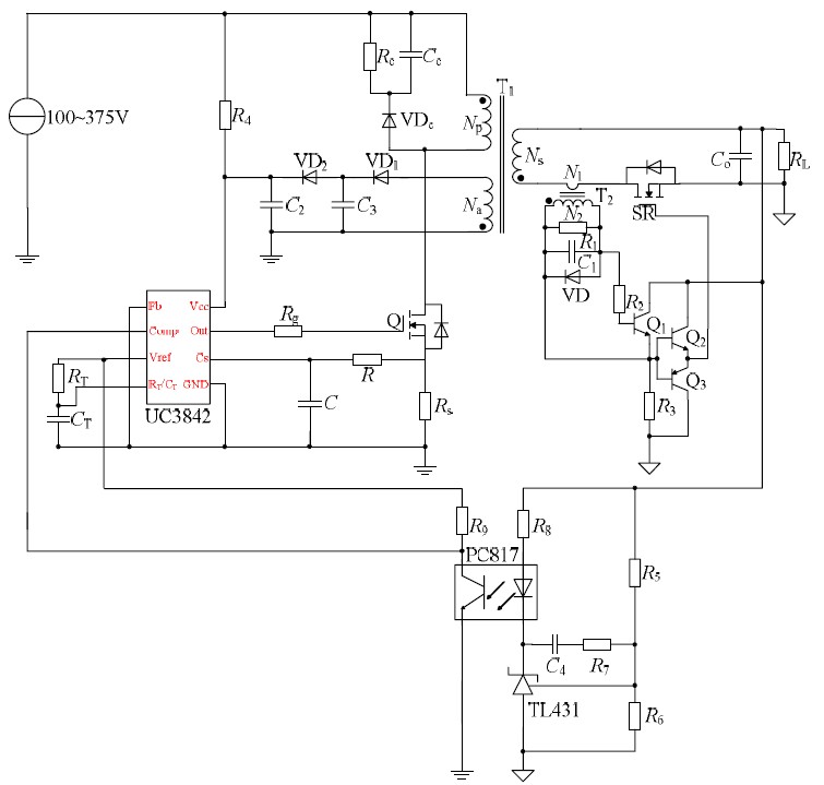 反激變換器應(yīng)用廣泛,采用同步整流技術(shù)能夠很好的提高反激變換器效率,同時(shí)為使同步整流管的驅(qū)動(dòng)電路簡單,采用分立元件構(gòu)成驅(qū)動(dòng)電路。本文詳細(xì)分析了同步整流反激變換器的工作原理和該驅(qū)動(dòng)電路的工作原理,并在此基礎(chǔ)上設(shè)計(jì)了100V~375VDC 輸入,12V/4A 輸出的同步整流反激變換器,工作于電流斷續(xù)模式,控制芯片選用UC3842,對設(shè)計(jì)過程進(jìn)行了詳細(xì)論述。通過Saber 仿真驗(yàn)證了原理分析的正確性,證明該變換器具有較高的變換效率。