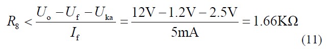 TL431 正常工作時(shí)需要陰極至陽極電壓Uka 大于2.5V,PC817 二極管正向?qū)▔航礥f為1.2V。所以: