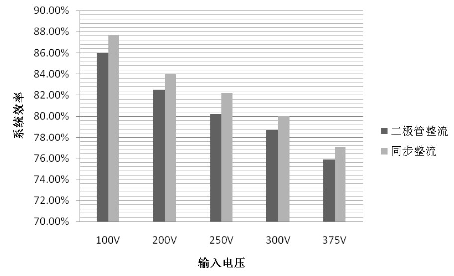 應(yīng)用 Saber 仿真軟件對本文設(shè)計(jì)的同步整流反激變換器進(jìn)行仿真。圖4 為輸入電壓200V,滿載時(shí),初級MOS 管Q、次級同步整流管SR 驅(qū)動(dòng)信號和次級電感電流波形。由圖可見,Q 關(guān)斷后,SR 經(jīng)過很短的延遲后就開通,次級電感電流降至接近零時(shí),SR 關(guān)斷。圖5 為輸入電壓100V、200V、250V、300V 和375V,滿載條件下,分別采用同步整流和二極管整流時(shí),系統(tǒng)效率的分布圖。