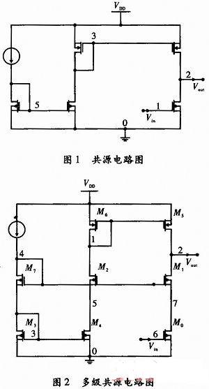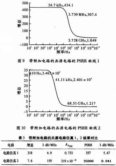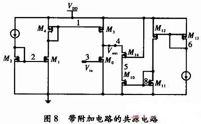 帶附加電路的共源電路如圖7和圖8所示,消除了使用工作以線性范圍內(nèi)的共源放大器,從VDD到輸出節(jié)點(diǎn)電源波動(dòng)的影響。
