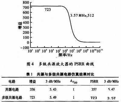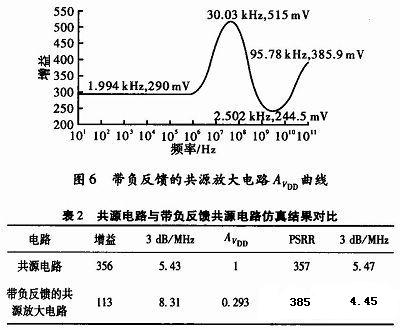 通過(guò)從VDD到輸出端能夠反方向影響電源波動(dòng)的負(fù)增益改善PSRR,從而反映到放大電路的輸出端。共源放大器為應(yīng)用這一技術(shù)提供了支撐,結(jié)果已被證實(shí)。