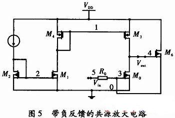 為構(gòu)建負(fù)反饋方法改善PSRR,對(duì)一種帶有負(fù)反饋的共源放大電路進(jìn)行了仿真,并與圖1中仿真的不帶負(fù)反饋的共源放大器進(jìn)行了比較。負(fù)反饋的電路如圖5所示,輸出電壓被采樣并控制M6,由M6的電流通過(guò)R0轉(zhuǎn)換為電壓,輸出電流及M0的輸入電流混合構(gòu)成。負(fù)載器件是PMOS管,其偏置電壓由一鏡像電路產(chǎn)生。在設(shè)計(jì)過(guò)程中,其電阻值是關(guān)鍵,因?yàn)樗鼪Q定著增益和PSRR值之間的平衡。電阻值過(guò)大會(huì)損失增益。