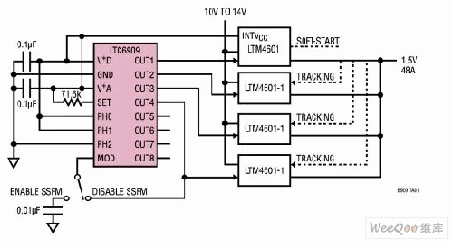 硅振蕩器為多相、擴(kuò)頻開關(guān)穩(wěn)壓器時(shí)鐘提供了一個(gè)理想的平臺(tái)。除了具有一個(gè)板上時(shí)鐘發(fā)生器之外,這些固態(tài)器件還能將擴(kuò)頻調(diào)制與多相輸出組合起來。考慮到這一點(diǎn),凌力爾特公司開發(fā)出了LTC6909(圖1),這是一款具有8個(gè)單獨(dú)多相輸出的精準(zhǔn)擴(kuò)頻硅振蕩器。單個(gè)電阻器負(fù)責(zé)在12.5kHz至 6.67MHz的范圍內(nèi)選擇輸出頻率。三個(gè)邏輯輸入用于設(shè)定輸出相位關(guān)系(范圍從45°至120°),從而允許LTC6909為多達(dá)8個(gè)相位提供同步??梢詥⒂靡环N偽隨機(jī)擴(kuò)頻調(diào)頻,頻率擴(kuò)展量在中心頻率的±10%。用戶可選擇3種調(diào)制速率之一,以確保調(diào)制速率不超過穩(wěn)壓器的帶寬。此外,LTC6909還具有一個(gè)創(chuàng)新的濾波器,該濾波器負(fù)責(zé)跟蹤SSFM調(diào)制速率并在頻率轉(zhuǎn)換之間提供平滑處理。