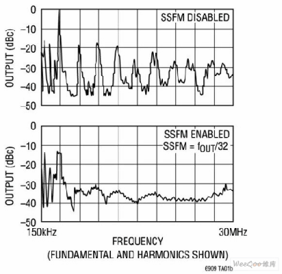 除了多相同步之外,還可以通過連續(xù)改變開關(guān)穩(wěn)壓器時(shí)鐘的頻率來改善EMI。這種被稱為SSFM的技術(shù)不允許發(fā)射能量在任何接收器的頻段中停留過長(zhǎng)的時(shí)間,從而改善了EMI。為了最大限度地發(fā)揮SSFM的效用,主要有4個(gè)必需考慮的因素:受影響接收器的帶寬、頻率調(diào)制的方法、頻率擴(kuò)展量和調(diào)制速率。
