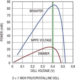 為了從光伏電池抽取最大功率,電源轉(zhuǎn)換器的輸入阻抗必須與電池的輸出阻抗匹配,從而使系統(tǒng)能在最大功率點上工作。圖3顯示了一個典型的單節(jié)光伏電池的功率曲線。為了確保抽取最大功率,光伏電池的輸出電壓應(yīng)該與功率曲線的峰值點相對應(yīng)。LTC3105 調(diào)節(jié)提供給負載的輸出電流,以保持光伏電池的電壓等于最大功率點控制引腳設(shè)定的電壓。因此可用單個電阻器設(shè)定最大功率點,并確保從光伏電池抽取最大功率和峰值輸出充電電流。