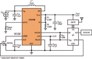 LTC3105是一款完整的單芯片解決方案,適用于從低成本、單節(jié)光伏電池收集能量。其集成的最大功率點控制和低壓啟動功能允許直接用單節(jié)光伏電池工作,并確保最佳能量抽取。LTC3105可用來直接給電路供電,或給能量存儲器件充電,以允許在黑暗或光照很少時工作。LTC3105使其有可能實現(xiàn)自主遠程傳感器節(jié)點、數(shù)據(jù)收集系統(tǒng),以及其他要求不依賴電網(wǎng)和最低限度維護的應(yīng)用。