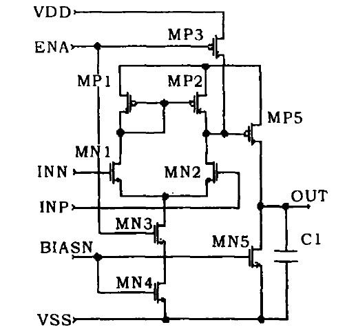 過(guò)放電檢測(cè)電路(VD2)可利用一個(gè)二級(jí)開(kāi)環(huán)比較器來(lái)實(shí)現(xiàn),如圖2所示。在設(shè)計(jì)中應(yīng)采用差分輸入并盡可能地提高增益,以滿足精度要求。該電路中,第一級(jí)是由MN1,MN2,MP1,MP2,MN3,MN4組成的差分放大器。第二級(jí)是由MP5,MN5組成的單級(jí)放大器。前級(jí)放大器放大輸入的差模信號(hào),后一級(jí)將前級(jí)的輸出進(jìn)一步放大,以達(dá)到數(shù)字信號(hào)的輸出電平。該比較器電路的直流增益為:
