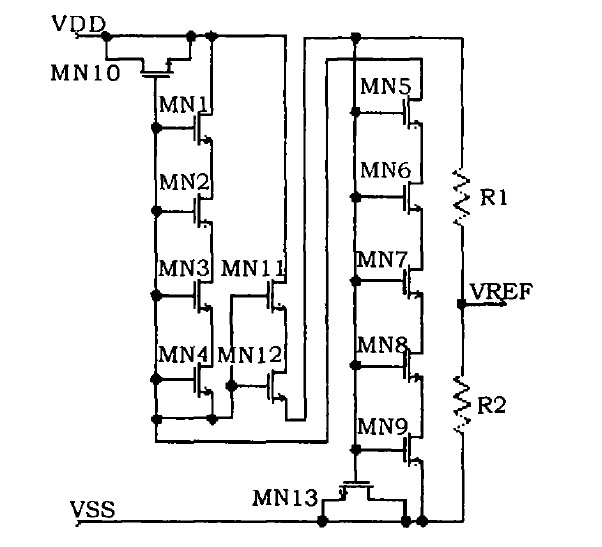 基于耗盡型NMOS管閾值電壓為負(fù)值,在VGS=0時(shí)也處于工作狀態(tài),該特性可有效降低其工作電壓及功耗。因而,該基準(zhǔn)電路中利用串聯(lián)的耗盡型NMOS管MN1-MN4、串聯(lián)的增強(qiáng)型NMOS管MN5-MN9、MN11-MN12和電阻R1、R2構(gòu)成基于VGS的基準(zhǔn)電壓電路,該基準(zhǔn)電路的輸出為檢測(cè)比較器反相端的基準(zhǔn)電壓信號(hào)VREF。