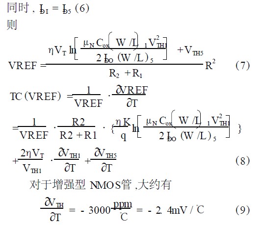 即對(duì)于增強(qiáng)型NMOS管,VTH隨溫度升高而下降,而對(duì)于耗盡型NMOS管,VTH為負(fù)值,其絕對(duì)值隨溫度升高而上升。由此推得,當(dāng)選取合適的參數(shù)時(shí),本電路的溫度漂移可以控制在較小范圍內(nèi)。