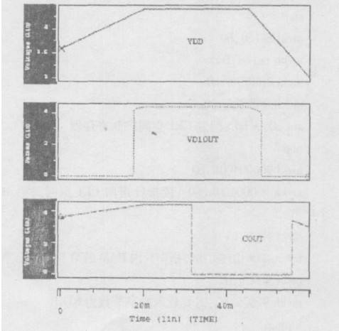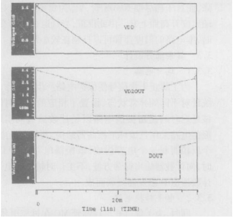 同時(shí),為了保證充電控制管MC在過(guò)充電狀態(tài)下有效關(guān)斷,利用電平轉(zhuǎn)換電路使輸出COUT端為邏輯電路輸出信號(hào)的四級(jí)反相,從而使COUT端低電平由VSS降至V-。