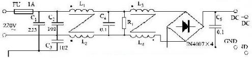 采用無源的EMI濾波器是抑制傳導(dǎo)干擾最有效的辦法。即在電路中插入一個帶通濾波器,讓50 Hz交流電暢通,其余頻率的信號受阻。但要嚴(yán)格控制濾波器LC元件的寄生參數(shù),它們的制作工藝、安裝位置、走線方式,都會影響EMI濾波效果。加接圖1所示的濾波電路,可以控制通過傳導(dǎo)耦合進(jìn)入電網(wǎng)的噪聲電平。
